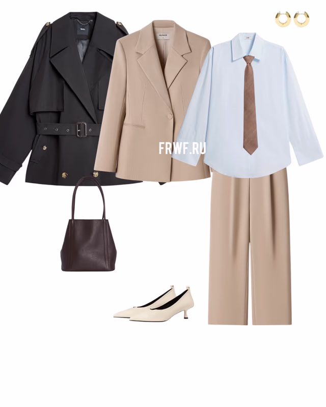 Есть стильные формулы, которые работают всегда. Одна из них – взять за основу образа вещи максимально простые, а затем дополнить их заметными деталями. Так мы и сделали: выбрали бежевый костюм, рубашку из хлопка и лодочки, а затем добавили к ним галстук, крупные серьги-кольца и сумку геометрической формы в роскошной шоколадном оттенке. Итог? Идеальный образ для понедельника!