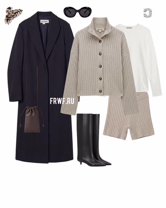Крошечные шорты в рубчик – сразу скажем, не база. Но если знать, чем дополнять, то с ними можно составить очень стильный образ. Мы выбрали белый лонгслив и кардиган из того же материала, которые можно дополнить длинным тренчем и высокими сапогами. Градус стиля повышаем при помощи аксессуаров: очки с крупной оправой, кафф, крабик для волос и микро-сумка – такая же миниатюрная, как и шорты.
