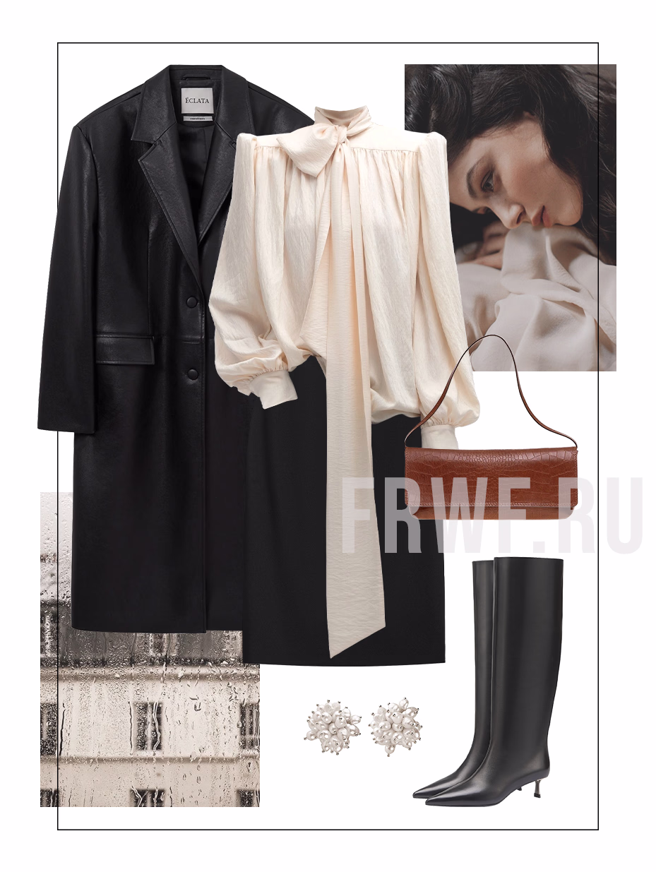 Представьте, что на этот понедельник выпала праздничная дата. А если есть, что отмечать, то нужны и подарки – мы как раз отыскали блузу с пышным бантом. Ее предлагаем сочетать с юбкой миди и высокими сапогами, а в качестве второго слоя примерить кожаный тренч – так в образе появится контраст, который слегка уравновесит градус романтики. Миниатюрная сумка, крупные серьги – противоположности притягиваются, так что это идеальный, по нашему мнению, мэтч.