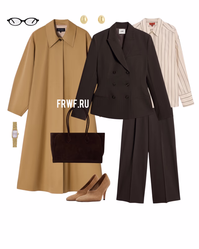 Этот понедельник – выходной, но отдыхать от стильных образов мы не планируем. В образе дня выбираем беспроигрышную классику: двубортный жакет, брюки со стрелками, рубашку с принтом и бежевое пальто. Благодаря полоскам в принте, на брюках и верхней одежде – это сочетание вытягивает силуэт, а схожие оттенки делают комбинацию гармоничной. В выборе аксессуаров продолжаем вдохновляться Кэролин Бессетт-Кеннеди: сумка-оверсайз, гладкие серьги и миниатюрные очки.