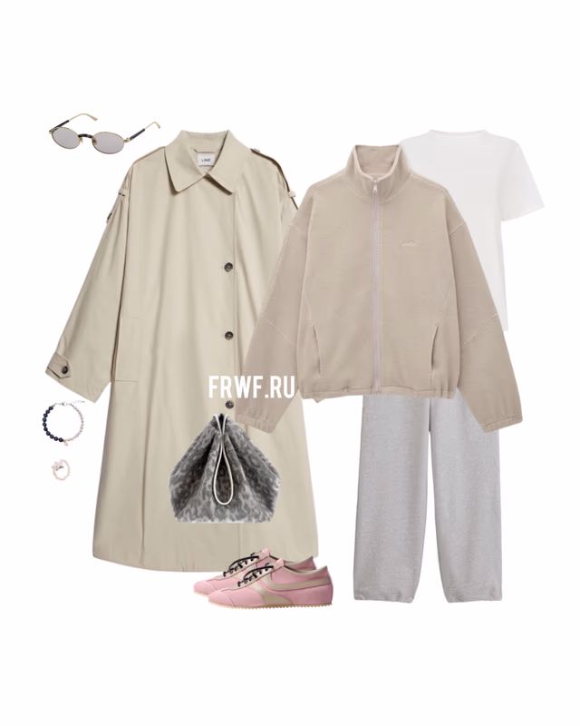 Если бы образы умели говорить, то этот сказал бы: «отключите рабочие уведомления». Он точно создан для неспешного выходного: удобные спортивные брюки, базовая футболка и мягкая флиска. Дополняем все тренчем все в том же бежевом оттенке, кроссовками на плоской подошве и миниатюрными очками. Из планов на день – только выпить любимый кофе и наслаждаться жизнью.