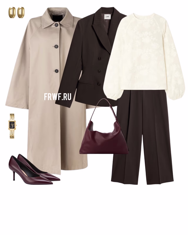 Костюм всегда выручает в тот день, когда вы не знаете, что надеть. Берем жакет и брюки в актуальном шоколадном оттенке, добавляем топ из гладкой струящейся ткани, а к нему – туфли в цвет костюма и плащ на пуговицах. Следом – аксессуары, и вот уже образ готов. Выглядит собранно и стильно, а минут на сборы ушло ровно столько же, сколько строчек в этом тексте.