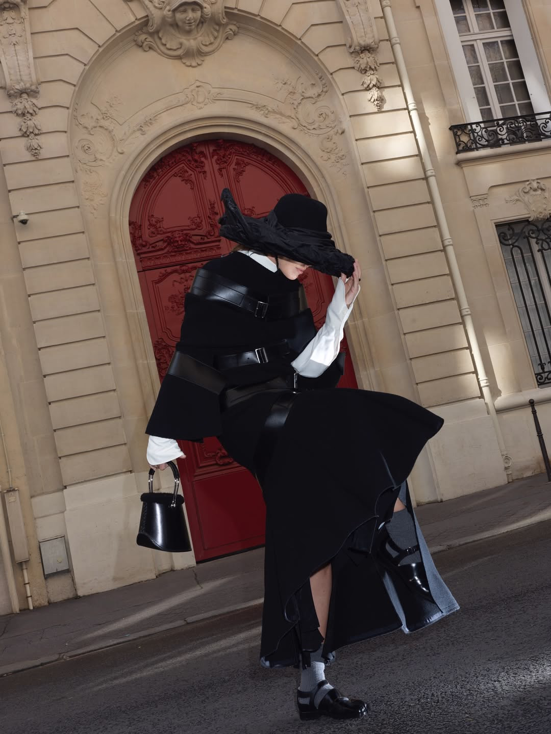 Да здравствуют слим-силуэты! В последнее время видим их даже чаще, чем привычный оверсайз. Причем настолько, что хочется уже повторить это в собственных образах. Начнем с базы – облегающей футболки из эластичной вискозы. К ней – синяя юбка в тонкую полоску (последний вздох офискора). Куртка здесь – приталенная и укороченная, с винтажным эффектом. Такую вполне мог бы выпустить Том Форд в своей эре Gucci, но мы отыскали ее в Toptop. А вот обувь очень непростая: не стандартные балетки, а пара, больше напоминающая кроссовки. Last but not least: сумка-такса с контрастными ручками и лаконичные серебряные детали.