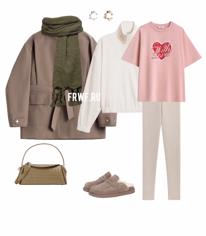 Замша – самый желанный и эффектный материал последнего сезона. И в этом образе ее действительно много: в тренче, вытянутой сумке-таксе и ботильонах. Все вещи – в карамельных оттенках, таких же приятных, как чашка рафа с карамельным сиром с утра. Под тренчем скрывается бескомпромиссная любовь к минимализму: белый лонгслив с длинными рукавами и джинсы с винтажным «потертым» эффектом. Украшения здесь тоже лаконичные, из тех, что можно носить каждый день, – серьги-кольца и подвеска на тонкой цепочке.