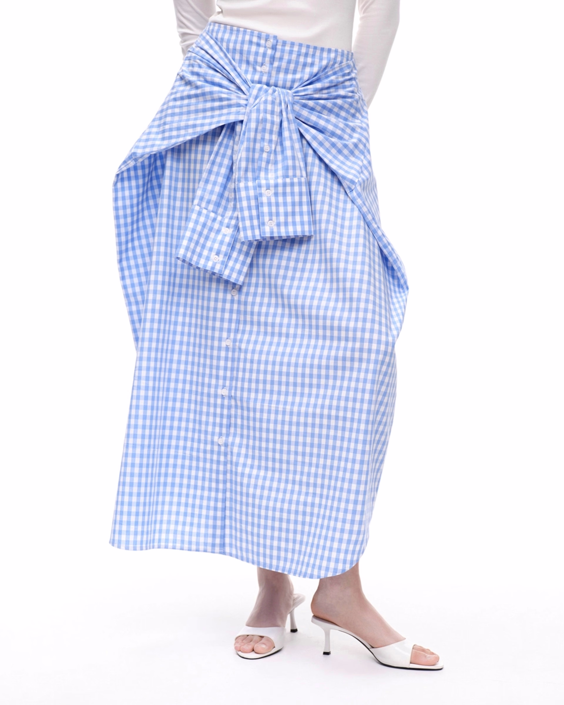 Длина миди, игривый клетчатый принт, красный или нежно-голубой оттенок (модель выпустили в двух цветах), а еще – рукава, напоминающие о классической рубашке. Мы бы не удивились, если бы увидели эту юбку на кадрах с афтепати Met Gala, ведь здесь и деконструкция, и аллюзия на костюм, и спокойный силуэт – как раз в тему выставки 'Tailored for you'. Думаем, что на вечеринку после бала такое могла бы надеть и Кайли Дженнер – надеемся, что никто не пришлет ей ссылку на Choux: вдруг она узнает, что упустила такой айтем, и очень расстроится.